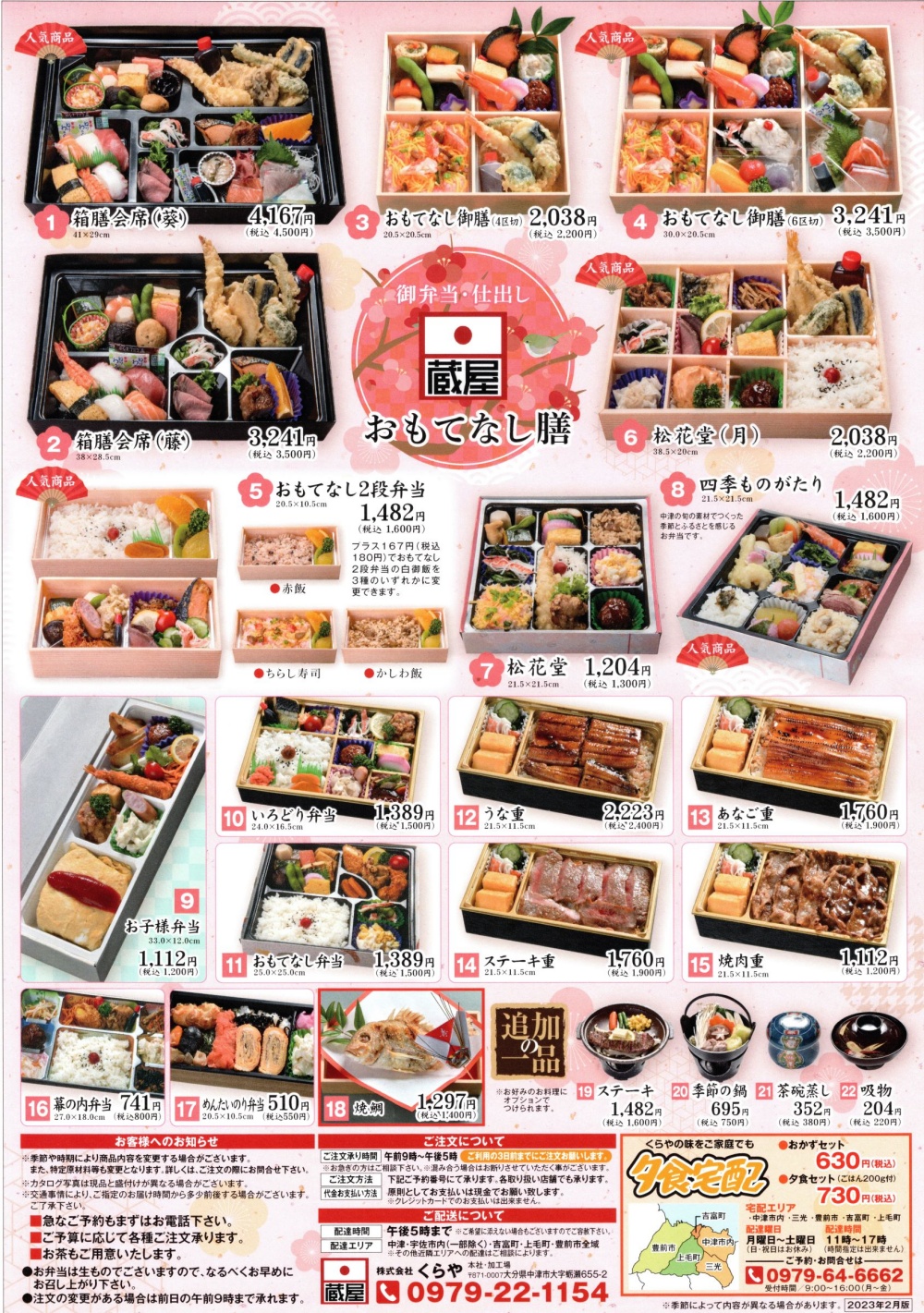 中津の旬の食材で作った四季ものがたり弁当のほかに、お弁当・オードブル・箱膳会席等、ご予算に応じて作っています。